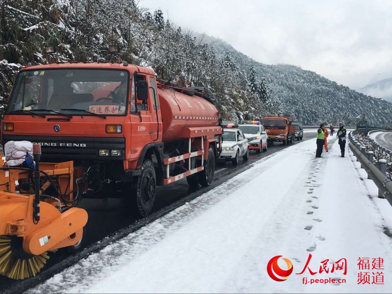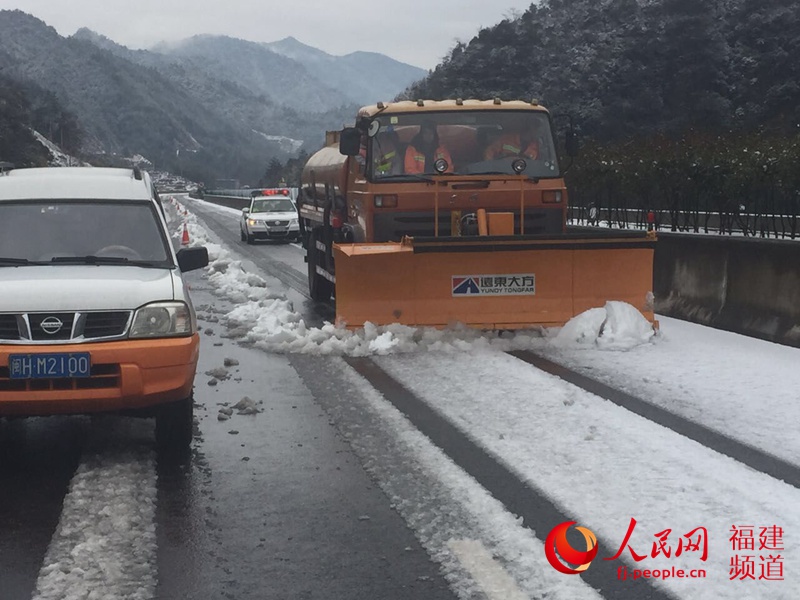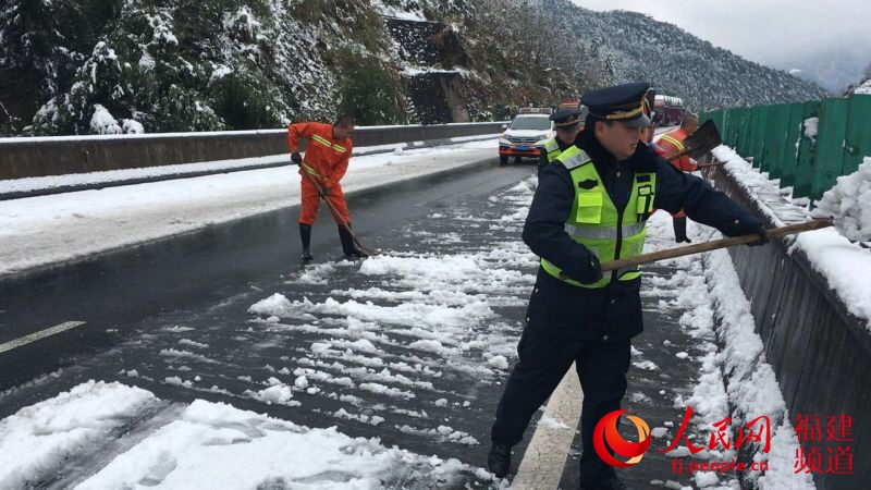 福建省高速公路公司應(yīng)急隊(duì)伍在清理公路積雪