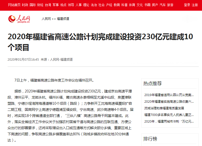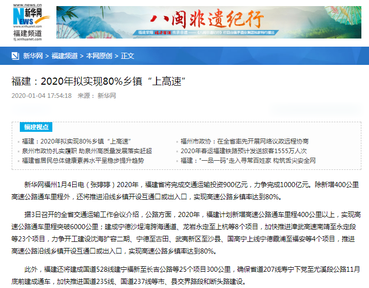2020年,福建省將完成交通運(yùn)輸投資900億元,力爭完成1000億元。除新增400公里高速公路通車?yán)锍掏猓€將推進(jìn)沿線鄉(xiāng)鎮(zhèn)開設(shè)互通口或出入口,實現(xiàn)高速公路鄉(xiāng)鎮(zhèn)率達(dá)到80%。
