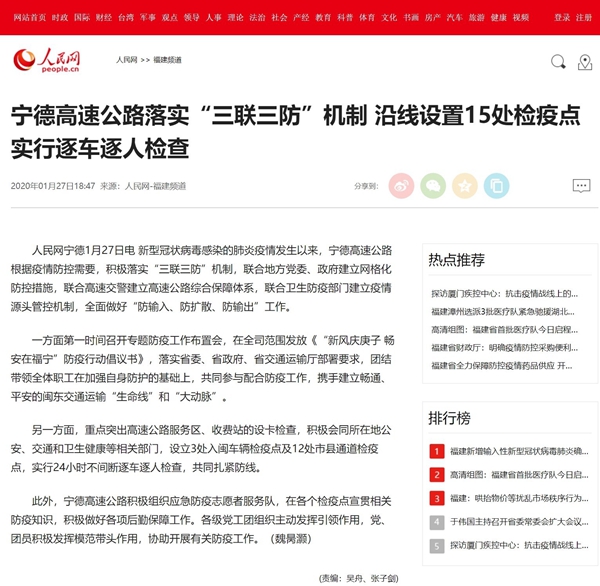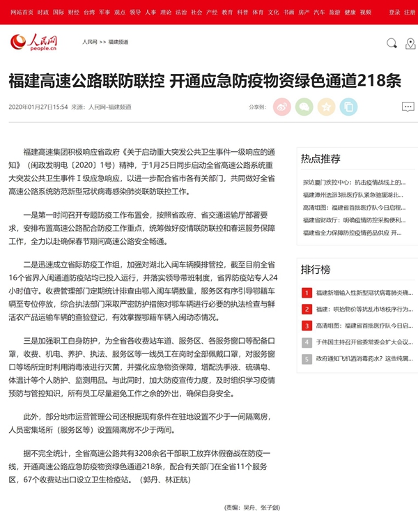 人民網(wǎng)多篇報(bào)道我省高速公路疫情防控工作