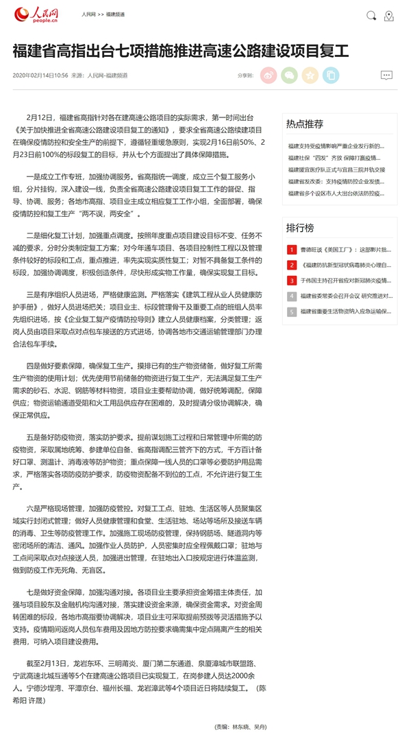 人民網(wǎng)|福建省高指出臺(tái)七項(xiàng)措施推進(jìn)高速公路建設(shè)項(xiàng)目復(fù)工