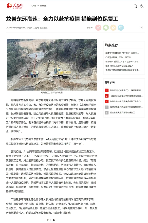 人民網(wǎng)|龍巖東環(huán)高速:全力以赴抗疫情 措施到位保復(fù)工