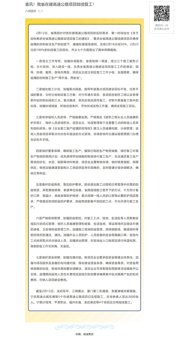 八閩國資|喜訊!我省在建高速公路項(xiàng)目陸續(xù)復(fù)工!