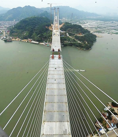 據(jù)悉,長(zhǎng)門(mén)特大橋自2016年1月正式開(kāi)工以來(lái),面臨多次16級(jí)臺(tái)風(fēng)正面登陸,由于橋的中跨高度很高,在江面60米以上,支架24小時(shí)都在伸縮變化,平均有效作業(yè)天數(shù)很有限,施工進(jìn)度受影響。廣大建設(shè)者克服塔梁墩固結(jié)區(qū)受力復(fù)雜、塔柱結(jié)構(gòu)變化多、臨時(shí)結(jié)構(gòu)多樣,以及超高超寬超重現(xiàn)澆箱梁施工、水文狀況復(fù)雜、氣候多變、高空作業(yè)多、安全風(fēng)險(xiǎn)高等諸多困難,相繼高效安全地完成了主塔樁基、大體積混凝土承臺(tái)、高索塔、邊跨現(xiàn)澆混凝土箱梁及大橋中跨鋼箱梁吊裝、斜拉索掛設(shè)等施工任務(wù),最終完成大橋合龍目標(biāo)。