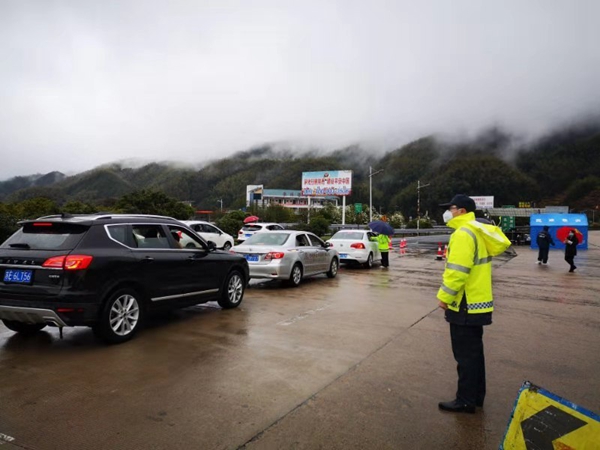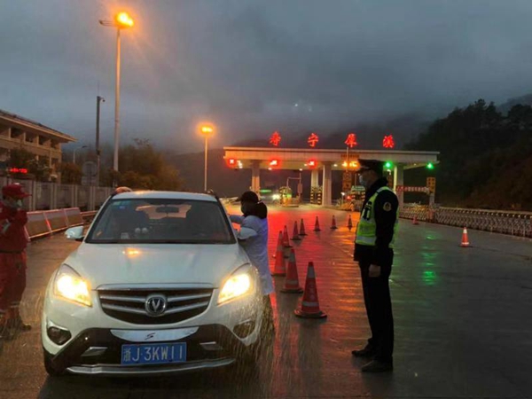 寧德高速綜合執(zhí)法壽寧中隊執(zhí)法員在溧寧高速壽寧犀溪收費(fèi)站防疫點(diǎn)引導(dǎo)車輛配合衛(wèi)健部門進(jìn)行檢測。